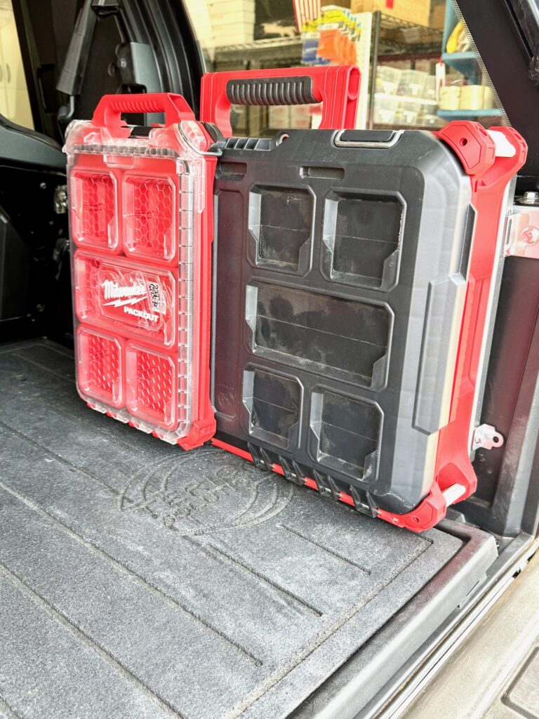 With this system you can mount large or small Milwaukee organizer bins securely to either side of the bed. We’ve tried to minimize storage space with this compact design. Installation utilizes the factory Max Bed Rail system and 2 push pins. Will require 2 holes to be drilled.